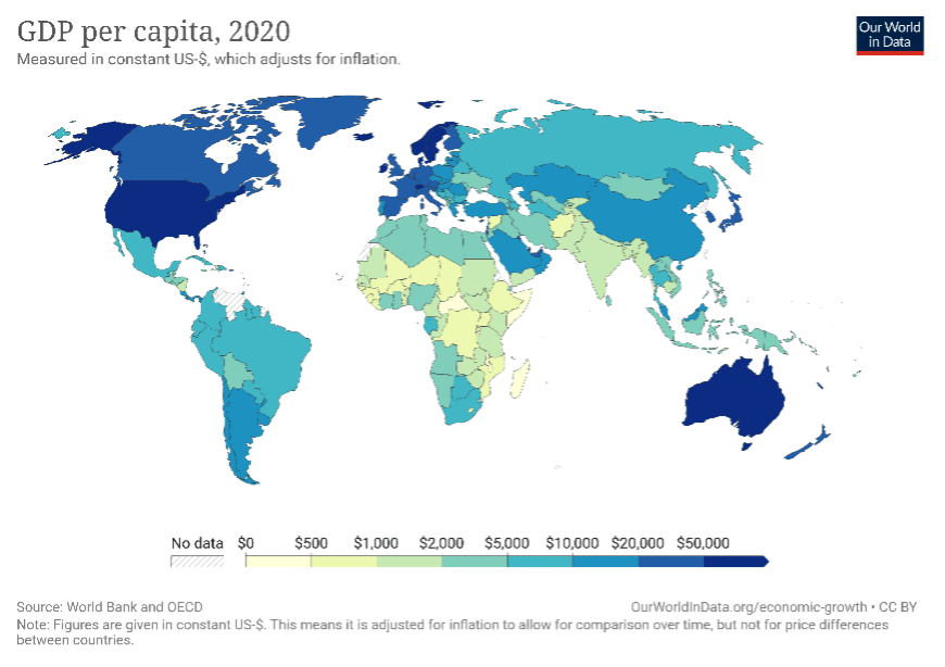 This measure can be divided by the country’s population, returning the amount of money that each individual gets in a particular country, known as GDP per capita, which provides a much better determination of living standards as compared to GDP alone, allowing comparisons between countries of different sizes.