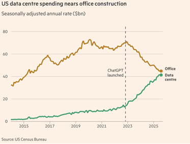 For example, since 2022, US investment has shifted away from typical office construction towards data centres, reflecting the rapid expansion in AI-driven infrastructure.