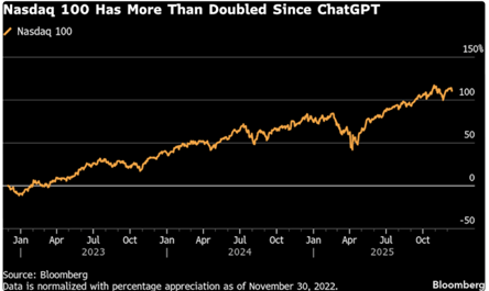 Over the last 5 years, NASDAQ-100 has delivered a total return of approximately 120.6%, representing a compound annual growth rate of 17.1%. An initial growth was driven by the post-pandemic digital shift, but the true catalyst was indeed the launch of ChatGPT.