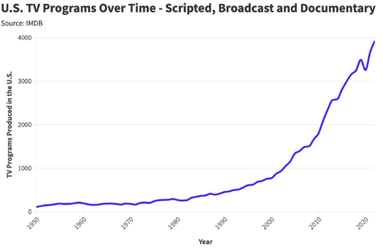 Figure 2: Number of TV programs produced in the U.S. from 1950 to 2022, showing accelerated growth in the digital age. Source: IMDB
